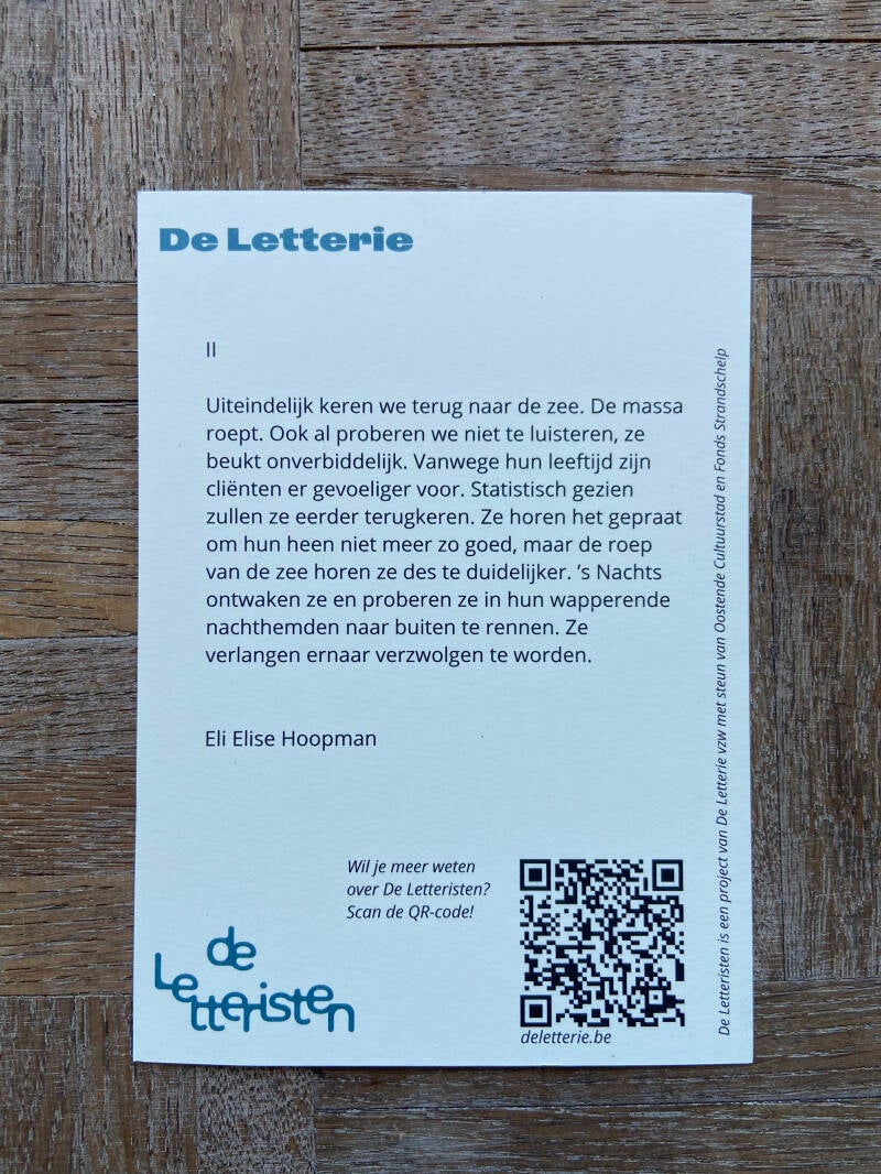 Eli Elise Hoopman schrijft fictie, met haar verhalen verkent ze de gruwel van vriendschap. Haar werk verscheen in literaire tijdschriften zoals DW B, Papieren Helden en Gpunt. Als Letterist onderzoekt ze Oostendse rusthuiscore.