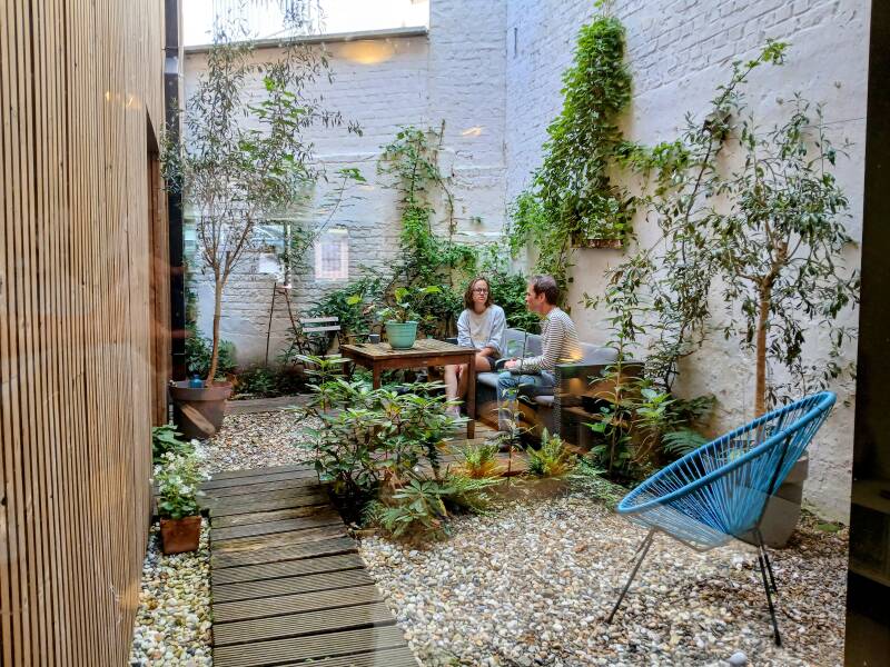 Het is een zaligheid om in het huis met de hoge ramen en prachtige lichtinval te verblijven. Er staan bureaus in de twee woonkamers, de bibliotheek, in de eetkamer en zelf in de plantenkamer. Er is een grote gemeenschappelijke keuken met een patio.
